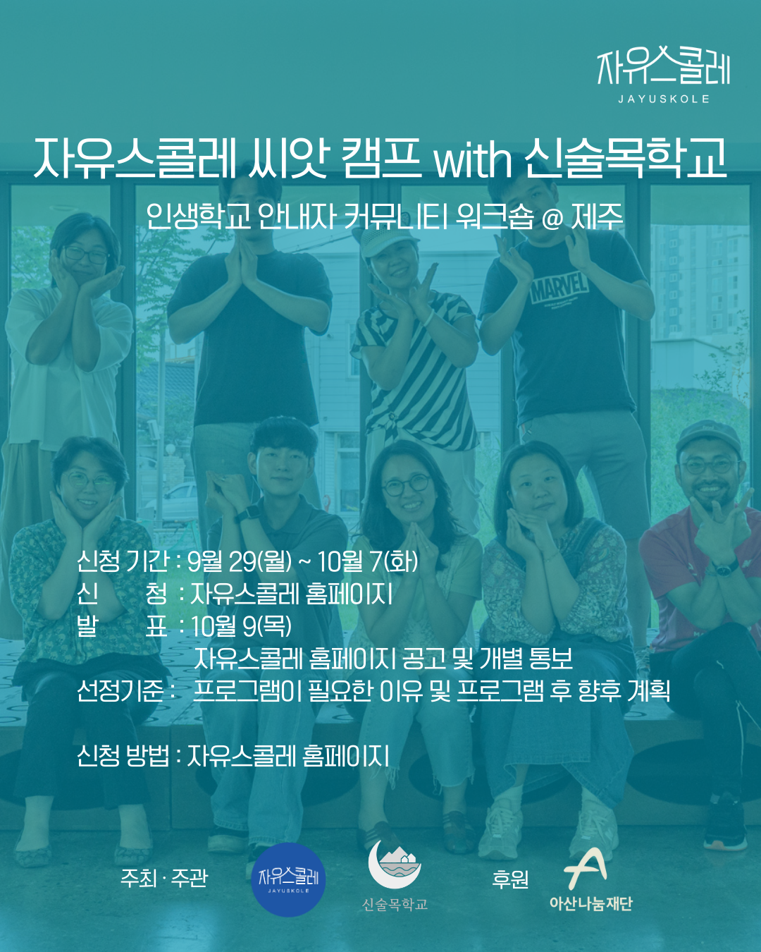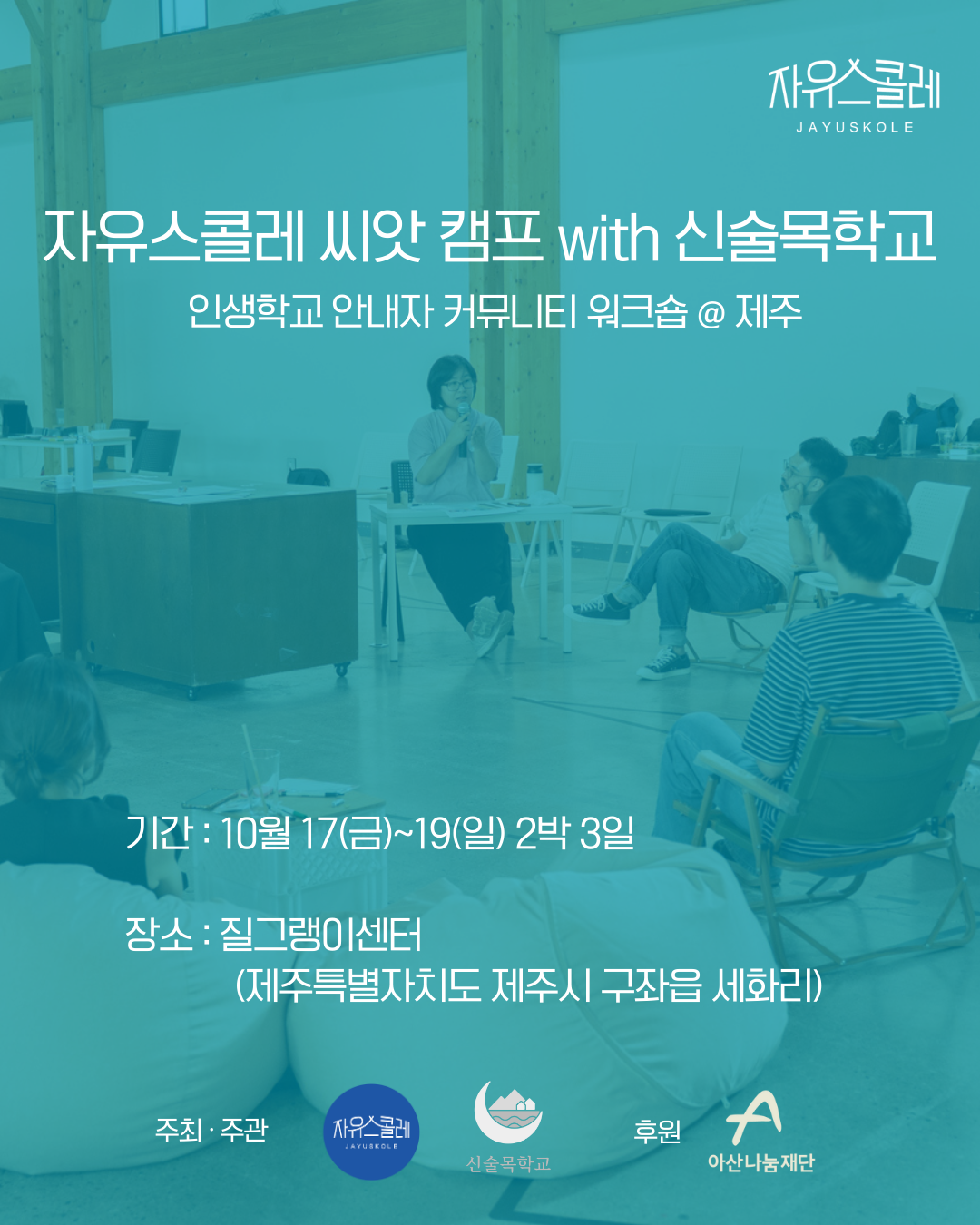 제주에서의 자유스콜레 씨앗캠프 교육워크숍은 신술목학교와 함께 만들어갑니다. 자유스콜레 씨앗 캠프 With 프로그램은 아산나눔재단, '2025 아산 비영리스타트업 도전트랙' 후원으로 만들어지고 있습니다. |