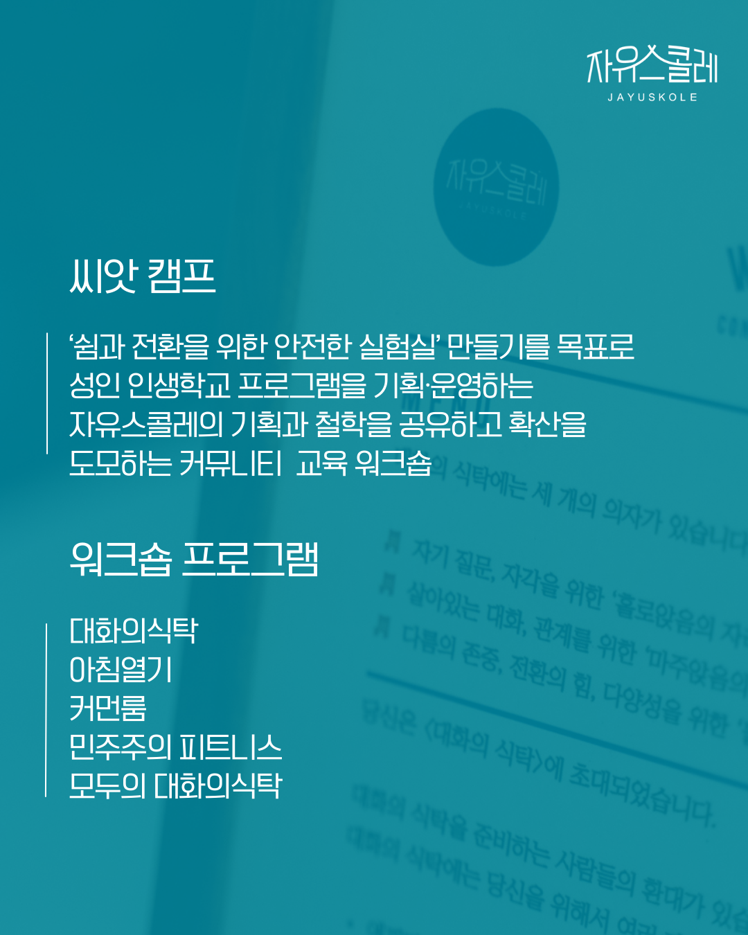 자유스콜레 씨앗캠프 with 신술목학교 삶을 위한 교육을 실천하고자 하시는 분, 일상에서 대화를 촉진하고 싶은 분, 민주주의를 교과서로 공부하기보다 직접 감각하도록 일깨우는 방법을 고민하는 누구나 참여해 주시면 좋겠습니다.