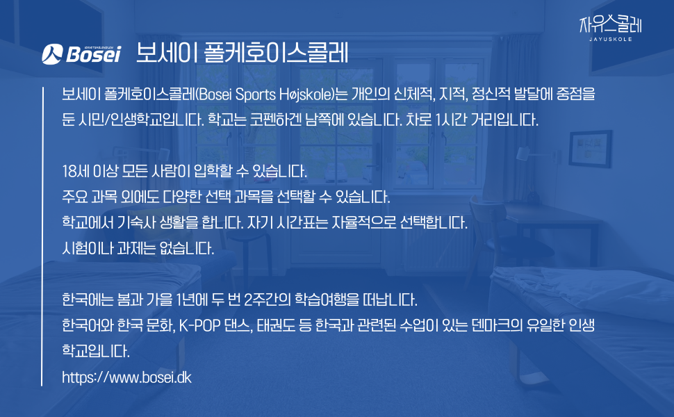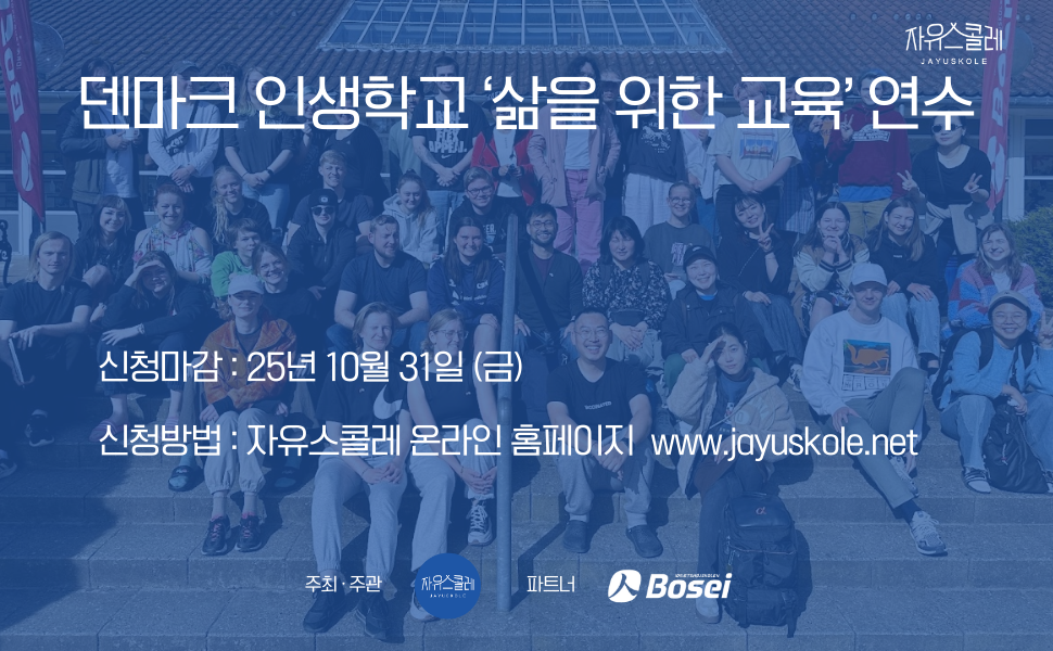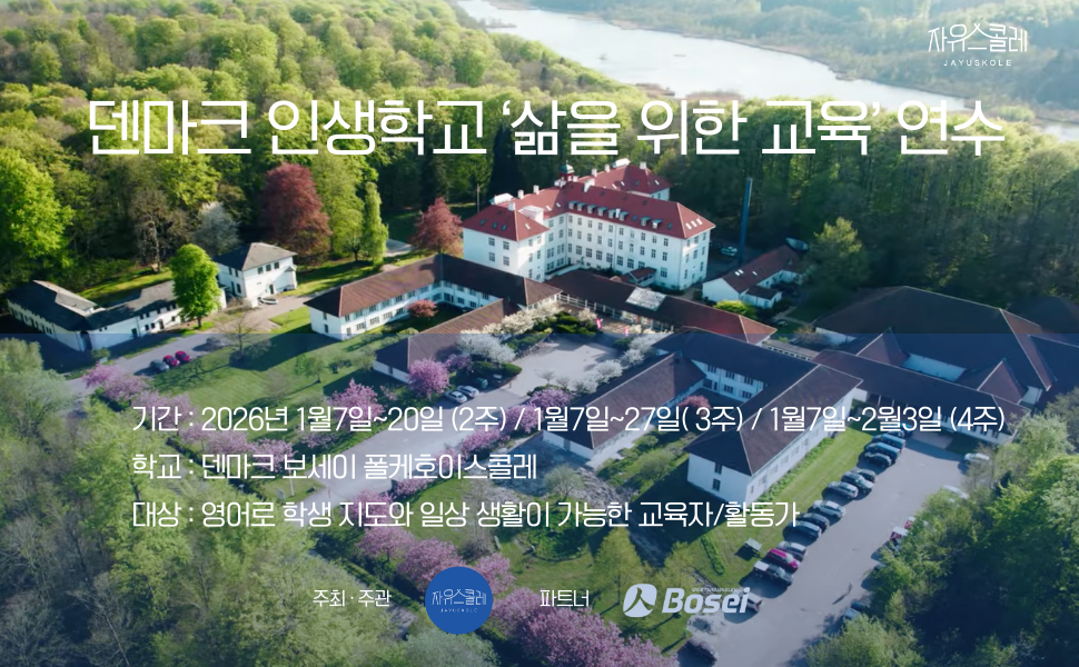 덴마크 인생학교 ‘삶을 위한 교육’ 연수 '쉼과 전환을 위한 안전한 실험실 만들기'라는 모토를 가지고 활동해온 자유스콜레가 덴마크 현지의 보세이 폴케호이스콜레의 협업을 통해서