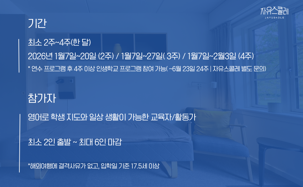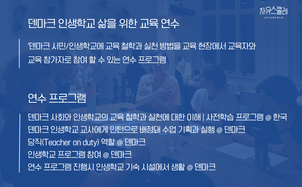 '삶을 위한 교육' 실천을 원하는 교육자/활동가들을 위해서 준비한 교육 연수 프로그램입니다.참가자들은 연수 프로그램에 교육을 받는 참가자로 참가하는 형식이 아니라 덴마크 시민/인생학교에 교육 철학과 실천 방법을 교육 현장에서 교육자와
